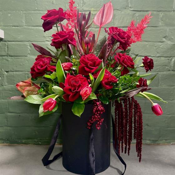 Make a bold statement with Midnight Velvet, a masterfully curated floral arrangement designed for those who appreciate the finer things. This isn't just a bouquet; it’s a centrepiece of passion and elegance. Nestled in a contemporary matte black cylinder, this arrangement features a dramatic blend of textures and rich, ruby tones.
