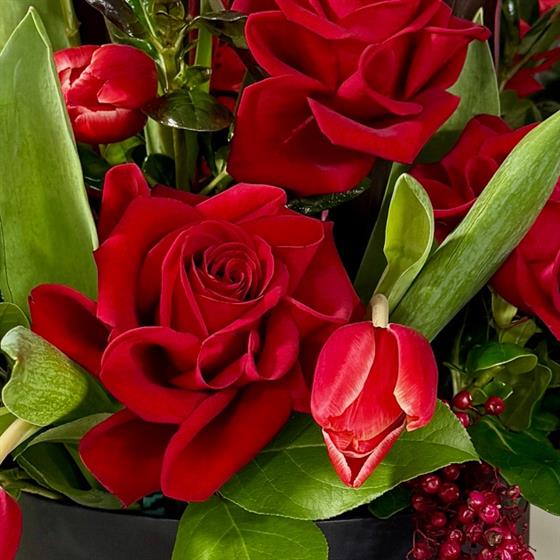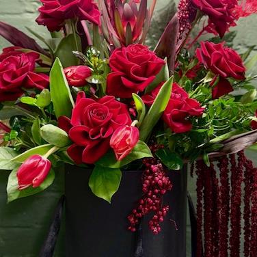 A Dramatic Palette, featuring deep red premium roses, vibrant tulips, and exotic Anthuriums for a modern twist on classic romance. Accented with cascading burgundy amaranthus and structural greenery to create a lush, multi-dimensional look.