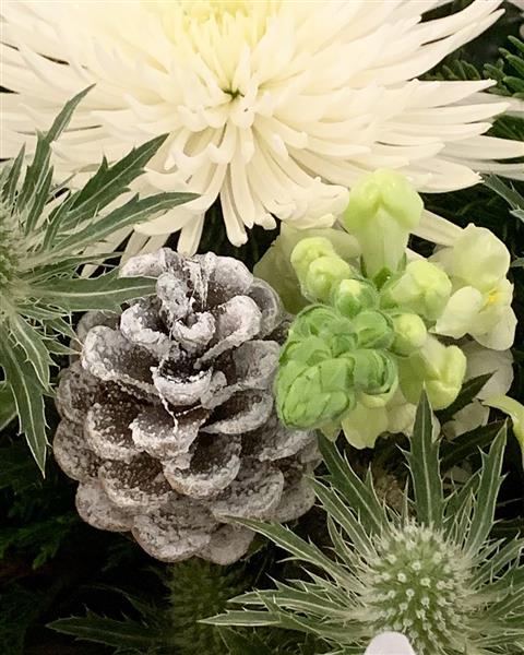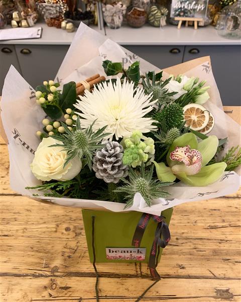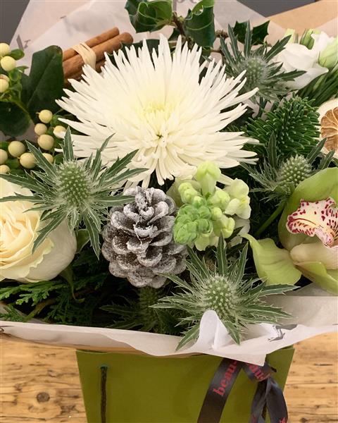 This is our stunning white winter Narnia gift bag. Full of crisp whites including a white rose, anastacia chrysanth, white berry hypericum, frosty thistle, lisianthus, snapdragon, and a lime cymbidium orchid, Festive foliage of spruce and conifer and holly. The gift bag is finished with decorative lime slices, cinnamon sticks and frosted pine cone.