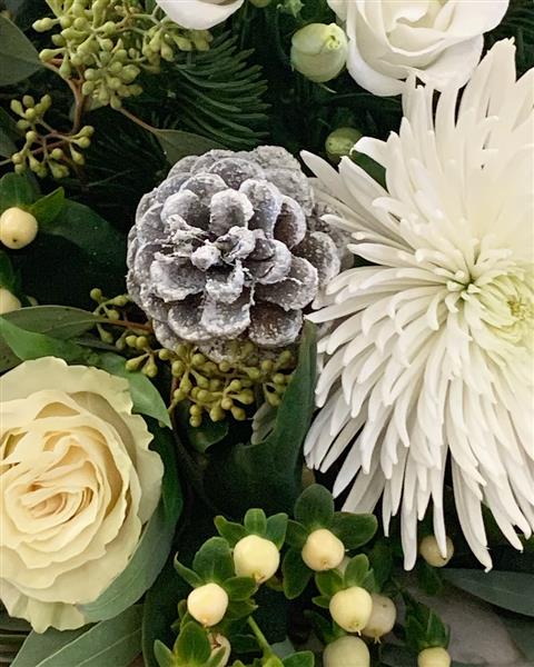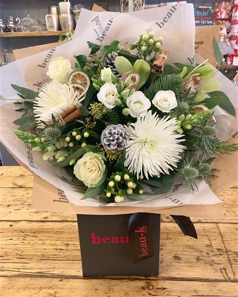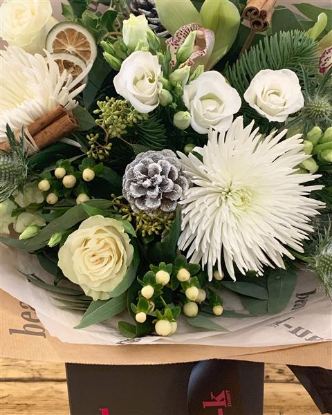 This is our stunning white winter Narnia bouquet. Full of crisp whites including roses, anastacia chrysanth, white berry hypericum, frosty thistle, lisianthus, snapdragons and lime cymbidium orchids, Festive foliage of spruce and conifer and holly. The bouquet is finished with decorative lime slices, cinnamon sticks and frosted pine cones.