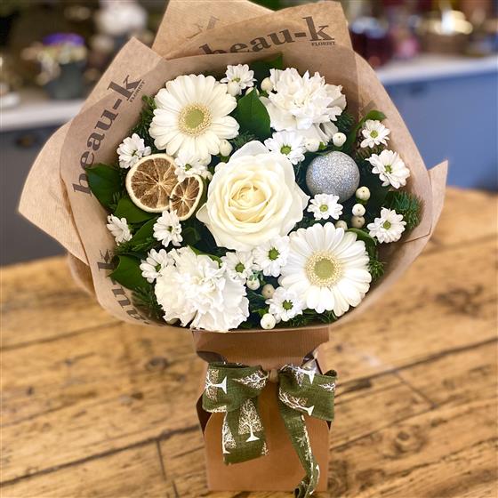 A petite arrangement to send with your Christmas Wishes, our Winter White Gift Box comes already prepared in water ready for instant display and contains a white rose, white germini, white carnations, white santini and white hypericum. Fragrant lime slices and festive decor and foliages.